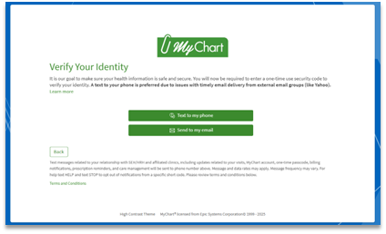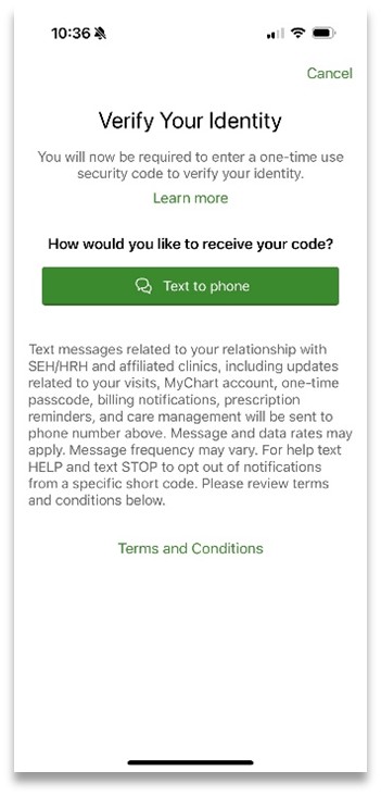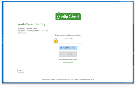 Use your username and password to access your MyChart account. Choose the option to receive a 6-digit unique code via Text to Phone. The verification code will be sent to your text messaging app within a few seconds of your selection.